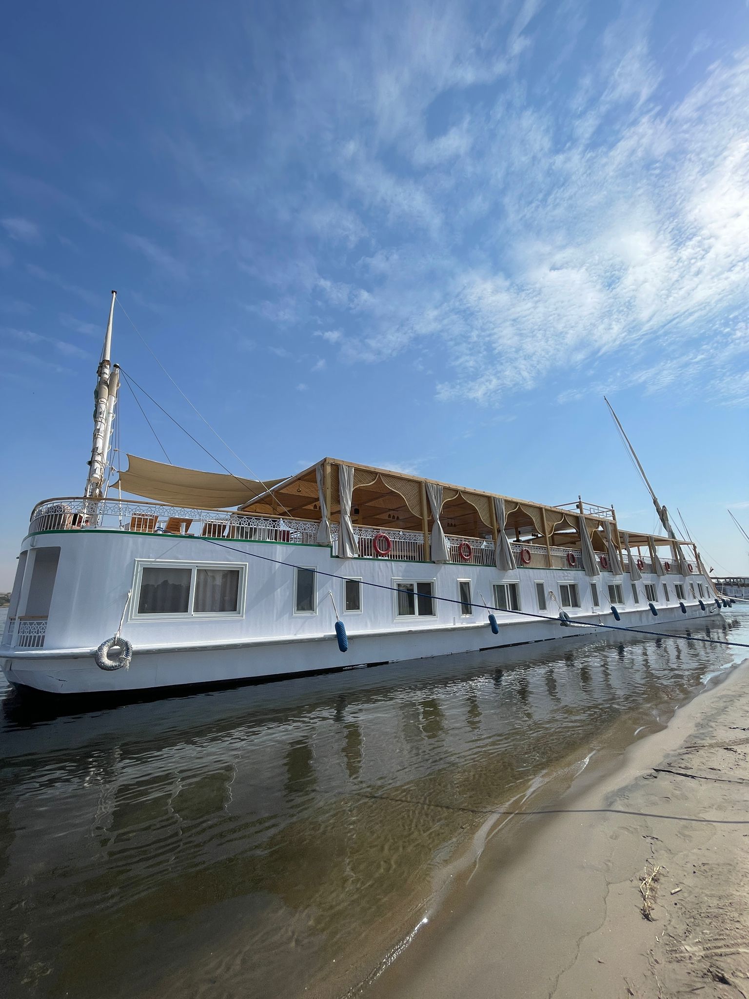 The dahabeya has two sails, there is no engine in it, so it is not noisy at all. Unsetting sails and sailing on the Nile is always the highlight of the voyage, but the tugboat also ensures that the boat can sail in windless weather.